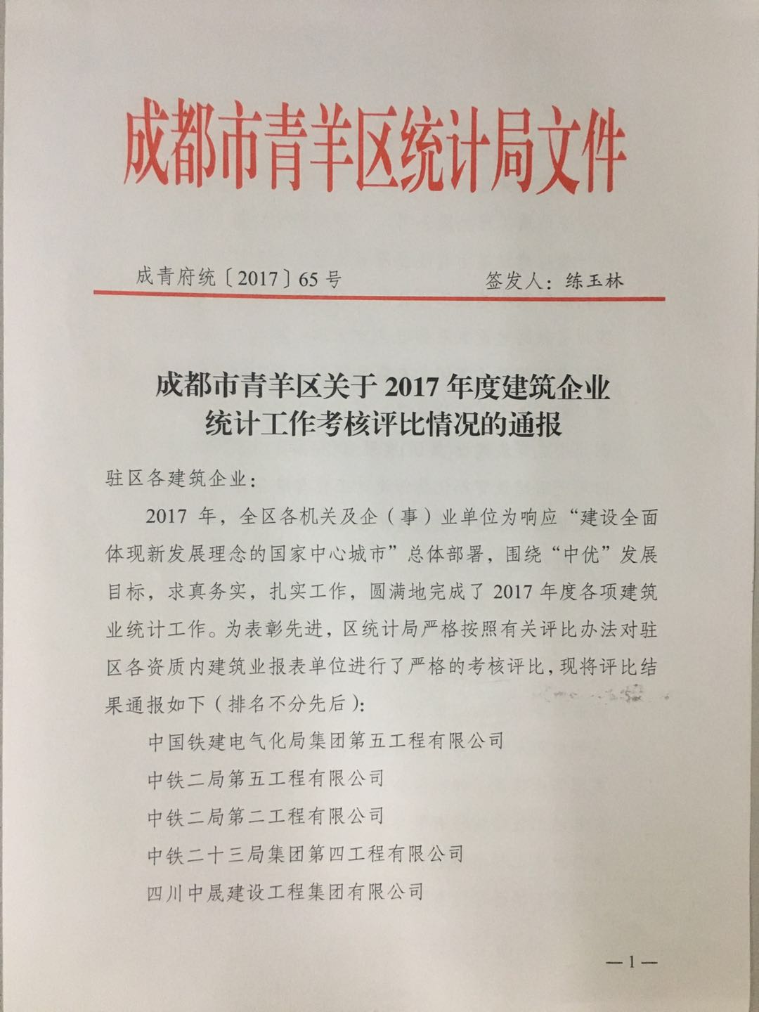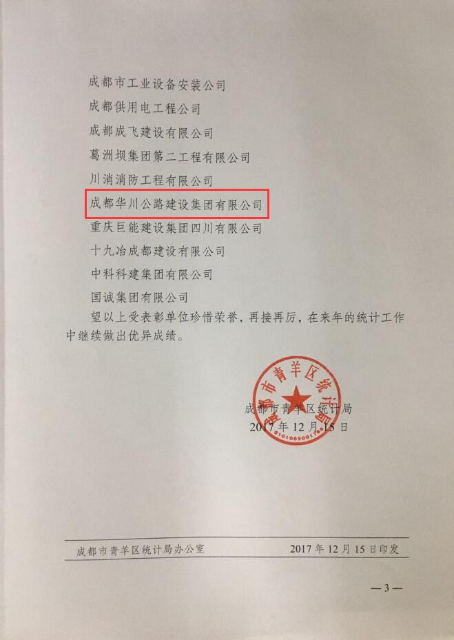 1月24日上午,青羊區(qū)統(tǒng)計局組織召開2017年建設領(lǐng)域統(tǒng)計工作年報會,對全區(qū)36家2017年度統(tǒng)計工作怎么怎么的完成較好的單位建筑企業(yè)進行了通報表彰,集團公司及集團子公司華川集團及華途公司均被評為先進榮獲青羊區(qū)建筑業(yè)統(tǒng)計工作先進單位。
