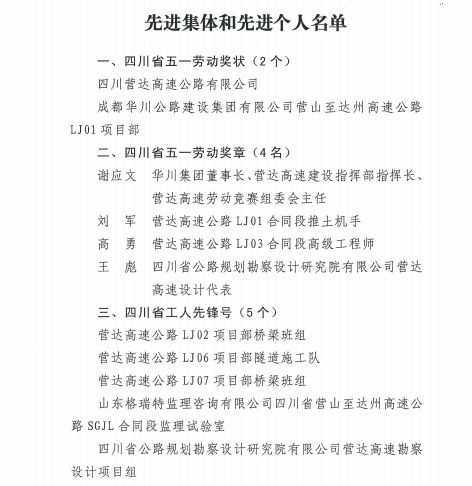 為此,省總工會(huì)特授予四川營(yíng)達(dá)高速公路有限公司、成都華川公路建設(shè)集團(tuán)有限公司營(yíng)達(dá)高速公路LJ01項(xiàng)目部2個(gè)集體“四川省五一勞動(dòng)獎(jiǎng)狀”;授予華川集團(tuán)董事長(zhǎng)、營(yíng)達(dá)高速建設(shè)指揮部指揮長(zhǎng)、營(yíng)達(dá)高速勞動(dòng)競(jìng)賽組委會(huì)主任謝應(yīng)文等四名同志“四川省五一勞動(dòng)獎(jiǎng)?wù)?rdquo;;授予營(yíng)達(dá)高速公路LJ02項(xiàng)目部橋梁班組等5個(gè)集體 “四川省工人先鋒號(hào)”;授予營(yíng)達(dá)高速公路LJ03項(xiàng)目部等5個(gè)“四川省重點(diǎn)工程勞動(dòng)競(jìng)賽先進(jìn)集體”稱號(hào);授予甘玉平等10名同志“四川省重點(diǎn)工程勞動(dòng)競(jìng)賽優(yōu)秀建設(shè)者”稱號(hào);授予營(yíng)達(dá)公司計(jì)量工程師唐華婧“五一巾幗標(biāo)兵崗(標(biāo)兵)”稱號(hào)。