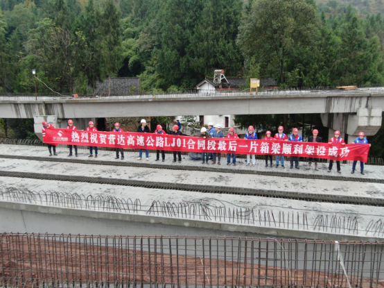1124日10時(shí)18,隨著新店樞紐互通G匝道最后一片小箱梁被吊裝設(shè)備穩(wěn)穩(wěn)安放在最后一跨墩柱上,現(xiàn)場慶祝的煙花頓時(shí)直沖云霄鞭炮聲、歡呼聲、吶喊聲響成一片。對于參與新店樞紐互通施工的每一個(gè)參建者來說,這是一個(gè)激動人心的時(shí)刻。新店樞紐互通最后一片箱梁順利架設(shè)成功,標(biāo)志著整個(gè)新店樞紐互通主體結(jié)構(gòu)施工全面完工,提前6天完成營達(dá)公司下達(dá)的目標(biāo)任務(wù)。